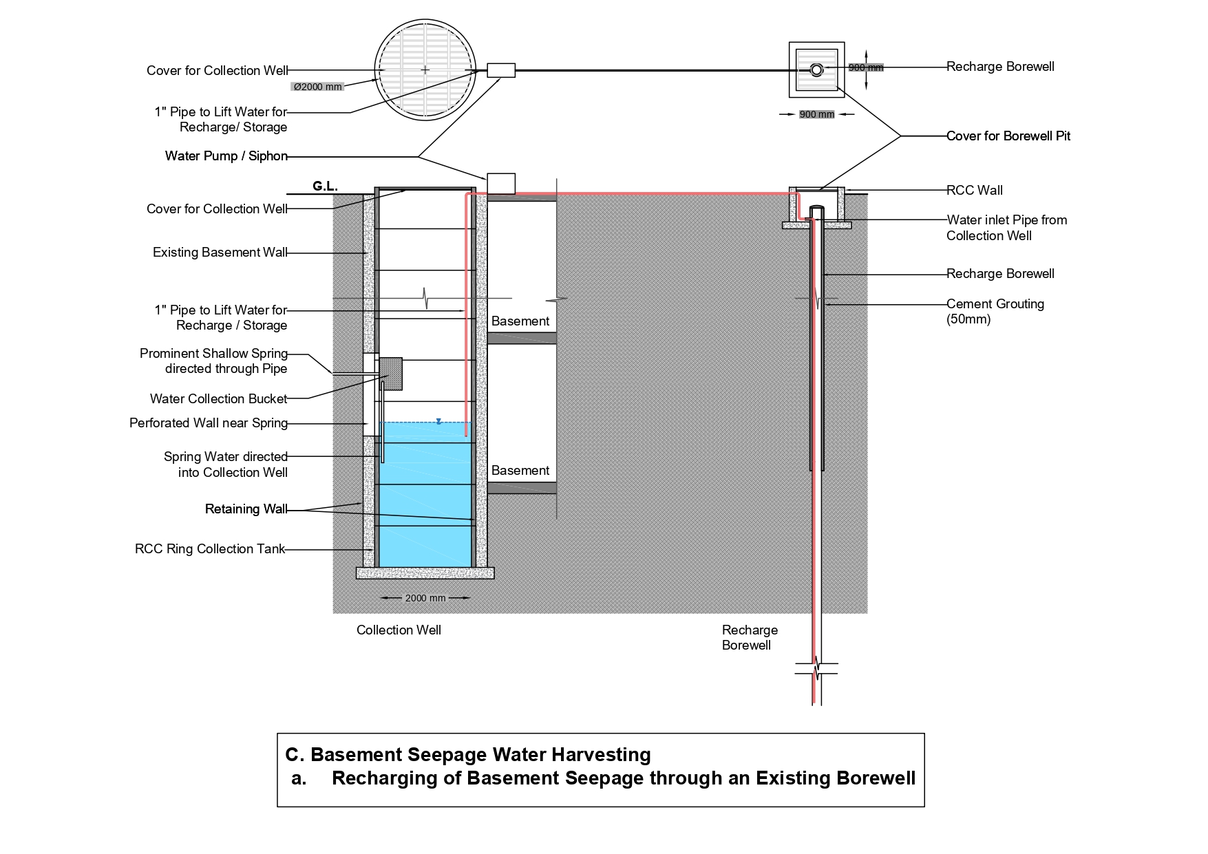 Based on the seepage discharge, construct the ring well of at least 2 m diameter. The depth will vary depending upon the location of the seepage.
