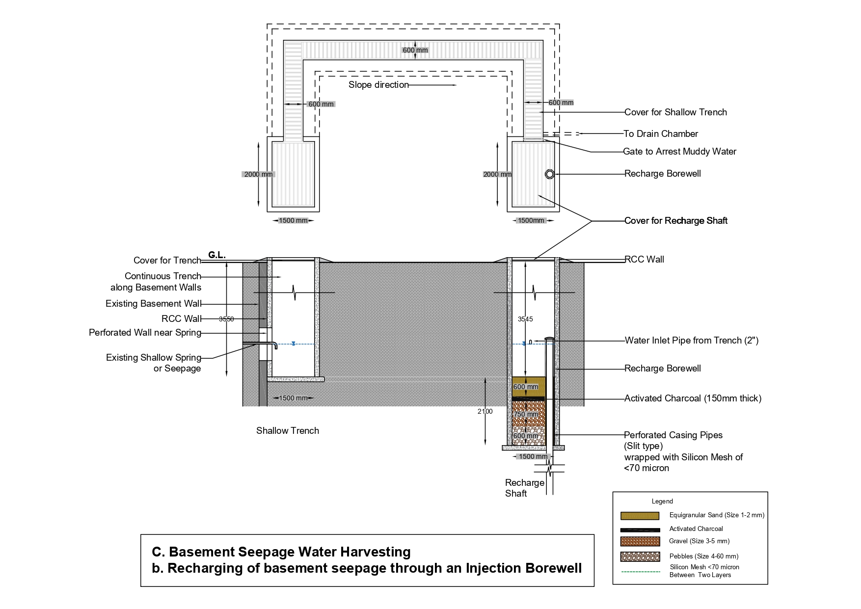 Near the seepage discharge point, construct a chamber at least of 1.5 m x 2 m x 3 m (Lx W x D) size. The depth of the trench will depend upon the depth of the seepage below the ground.