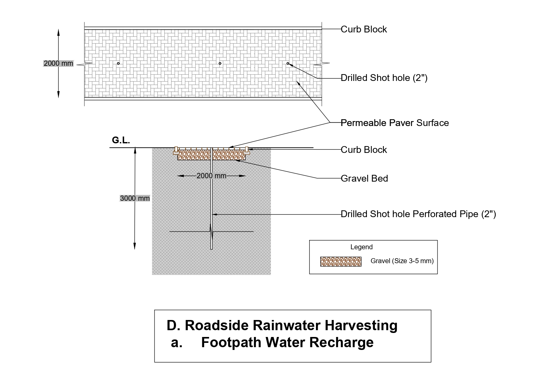 Immediately insert a perforated PVC pipe of 2” diameter in the hole. Keep the height of this pipe 1” below the pedestrian walk. Fill the pipe with washed clean equigranular sand. Close the PVC pipe with a PVC cap.