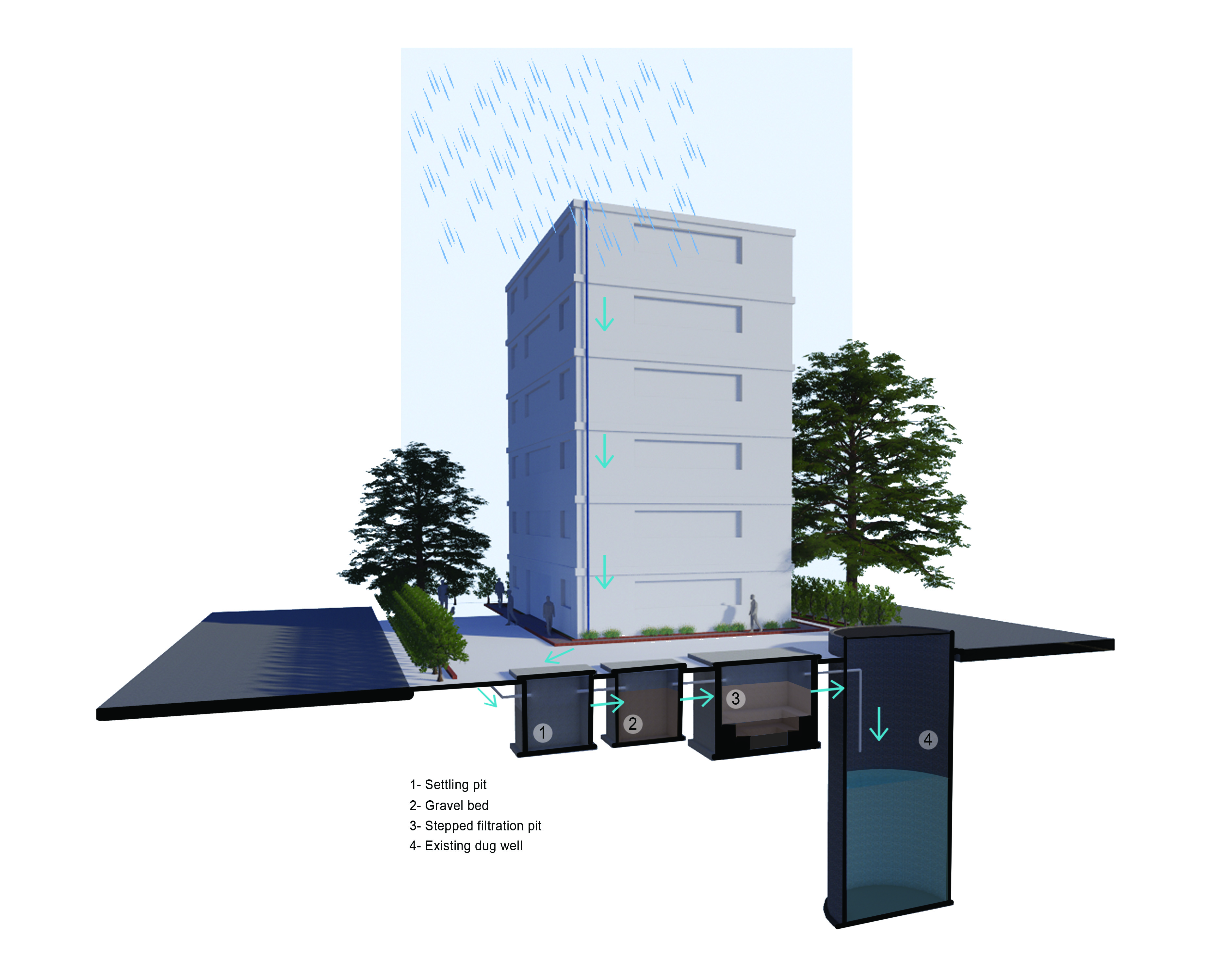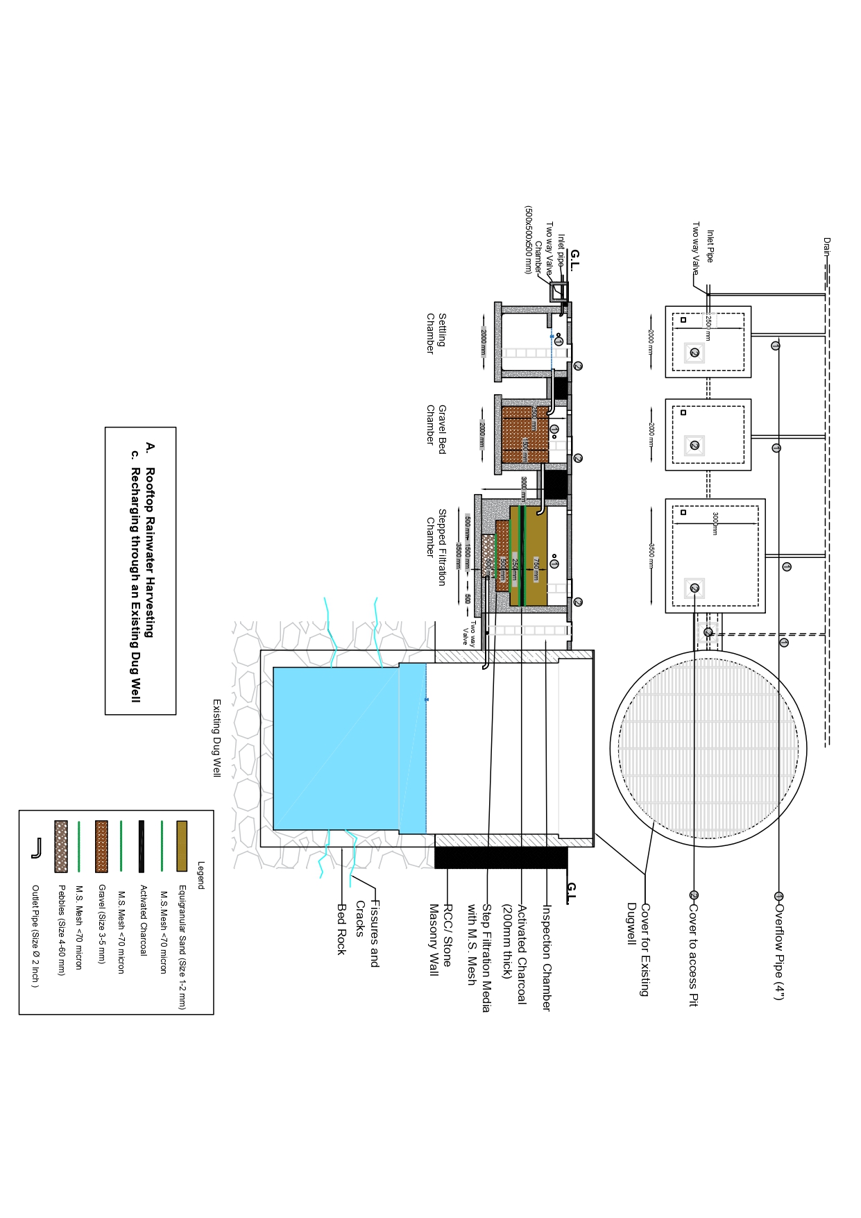Using RCC slab, construct a settling tank of 2 m x 2 m x 2.5 m (L x W x D) size to collect the roof top rainwater. In continuation with this, construct a second chamber of the same size (2 m x 2 m x 2.5 m) for the Gravel Bed tank. In continuation with this, construct a stepped filtration tank of 3.5 m x 3 m x 3.5 m (L x W x D) size using RCC slab, to collect and filter the roof top rainwater. Please refer to the drawing for further detail.